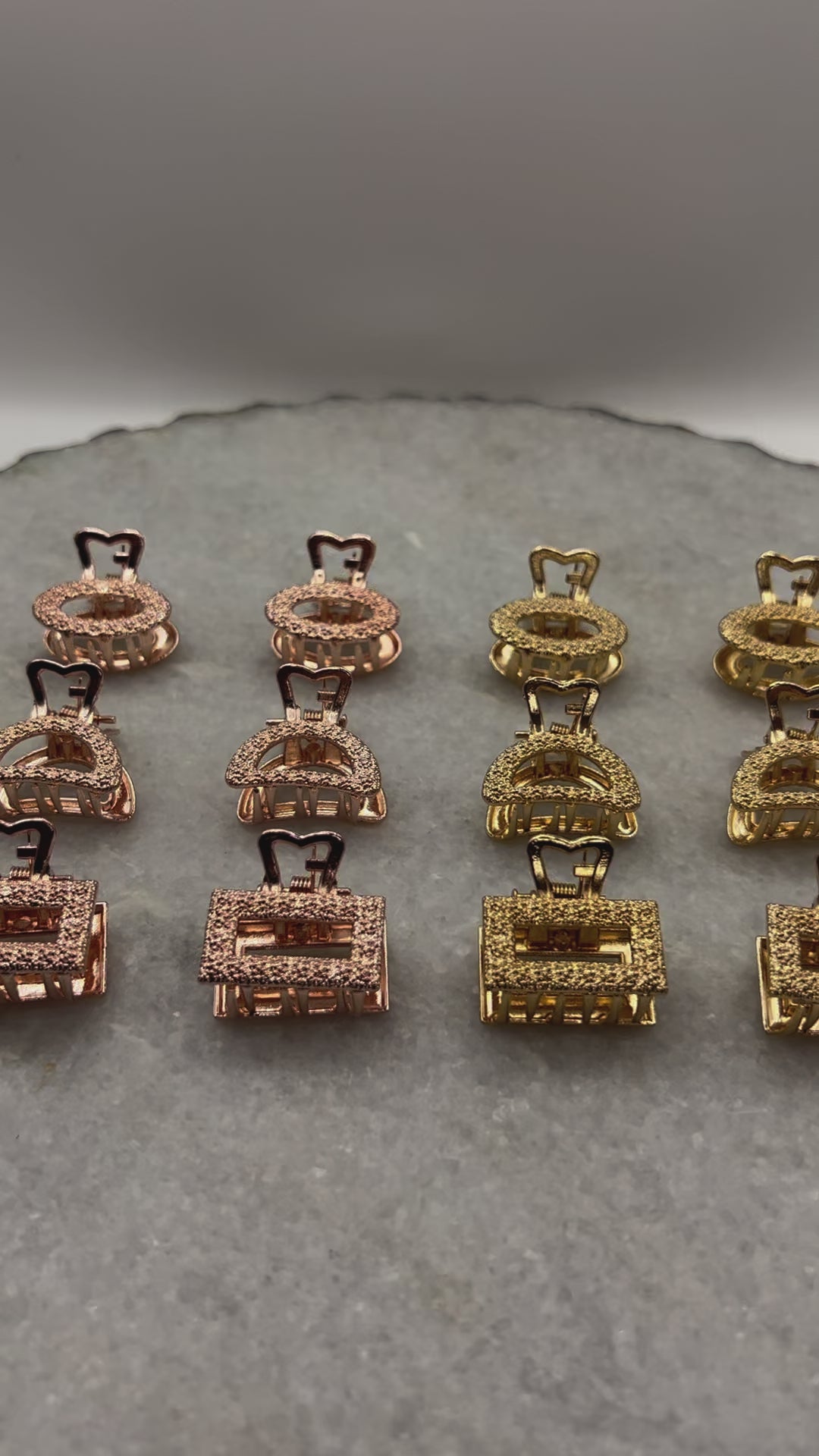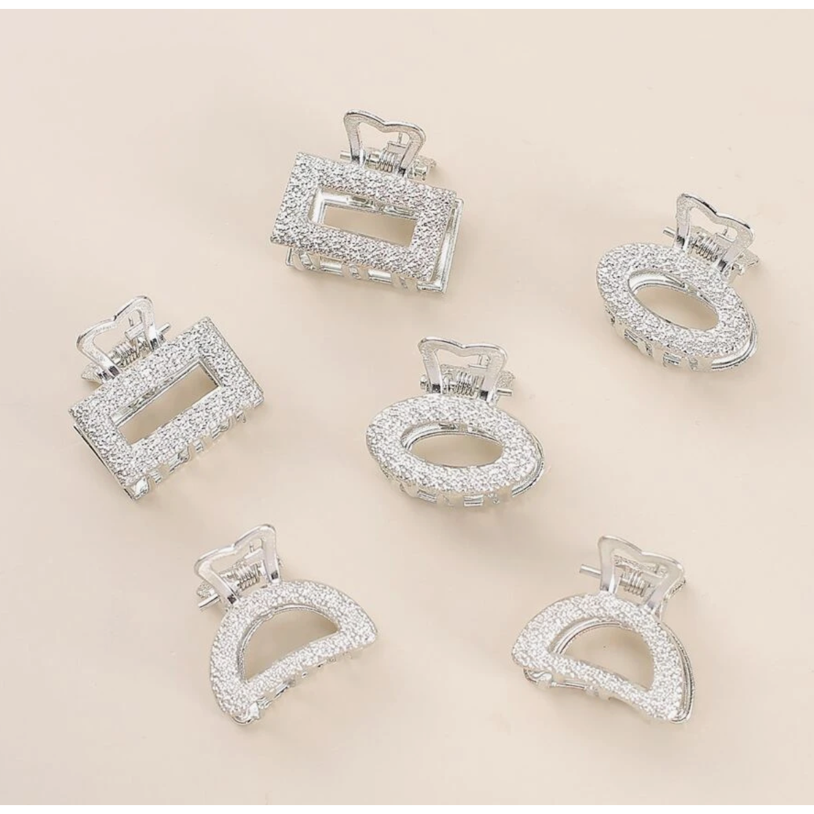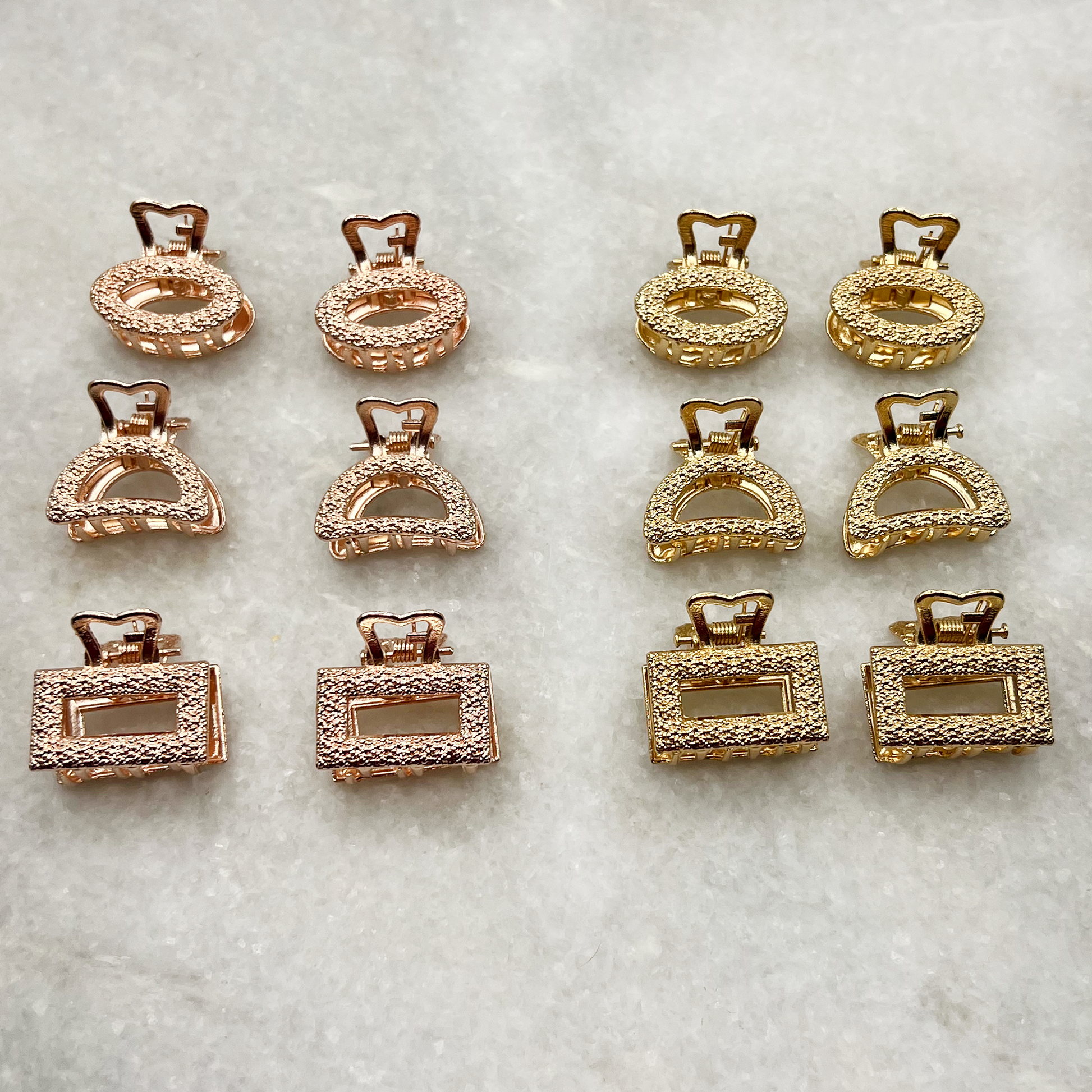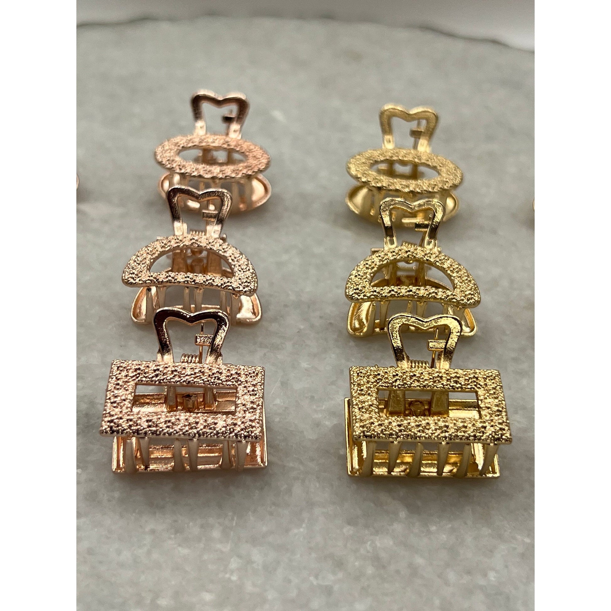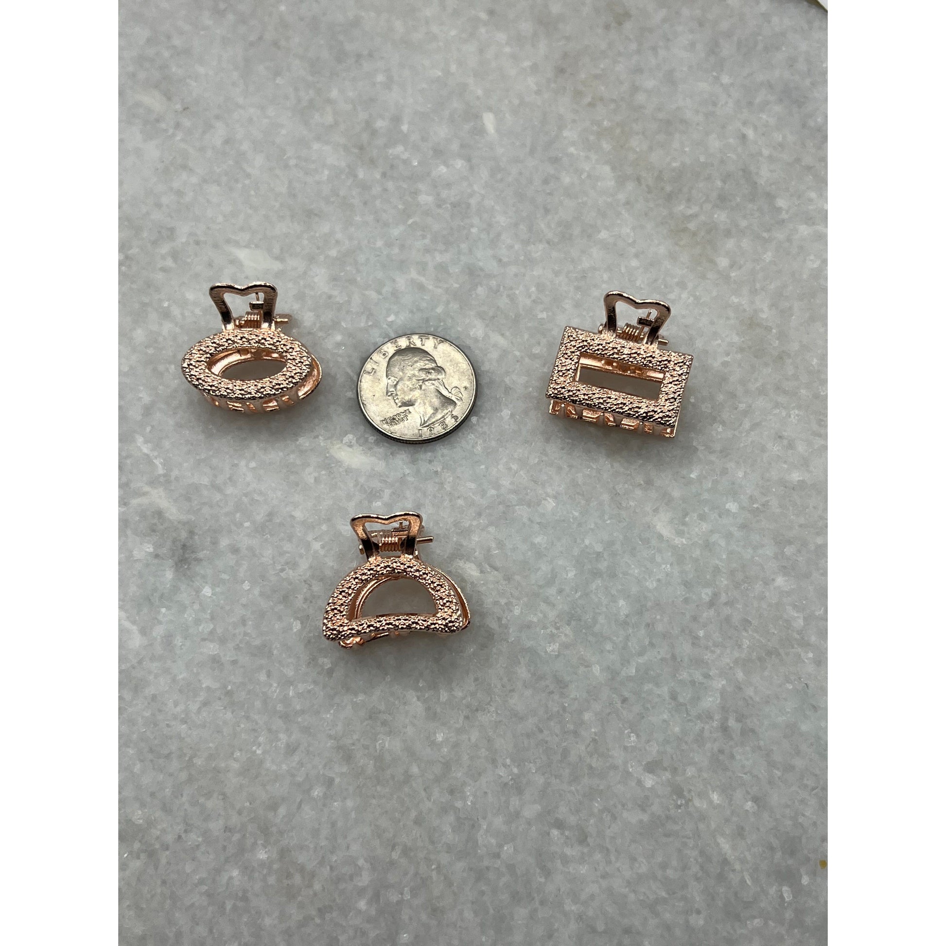 These small metal hair clips are quality clips that work on both fine and thick hair. The Aria & Eden minimalist hair claws come in a glamorous metallic rose gold, gold, or silver in 3 different shapes: rectangle, half-moon, and oval. Each looks beautiful with a light-catching texture meant to mimic rhinestones. They are each 1 inch long by .7 inches wide in size. These small-sized hair clips are perfect for fine, thick, and short, medium, or long hair lengths.